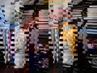 Image: The Trust's Senior Costume Interpreter, Alison Phillips, working on the replica costume in the Costume Project's workroom in 2023.